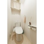 TOTOの組み合わせタイプ、ピュアレストMR。お掃除のしやすさが特徴です。 タオル掛けとペーパーホルダーも白に統一。 ペーパーホルダーが棚になっているのでちょっとした小物を置くことができます。