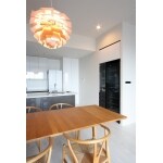 ポール・ヘニングセンがデザインした、名作・PHアーティチョーク。視線を集めるこの主役が、3mの広々とした天井高を強調します。72枚すべてのシェードに光源の光が正確にあたり、器具自体を照らす美しい間接光と、グレアのない良質な光は、やはり本物です。