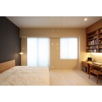 間仕切り壁を撤去して2部屋を1室にすることにより、広々としたくつろぎの寝室が出来上がりました。ベッドサイドの手元灯として、ルイスポールセンのペンダントライトを2灯、天井から吊り下げています。シンプルだけれど、おしゃれな演出になりました。また、足元側の壁面には、こだわりの書斎コーナーを造りました。