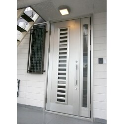 玄関ドアはYKKプロント通風タイプを設置しました。鍵をかけた状態でも、風が抜けるので室内の換気が出来、エアコンをつけない時でも風が取り込めるのでとってもエコです。 親子扉の子扉にはガラスの採光部を設けたため、光が入り明るい玄関になりました。また、既存タイルから大理石に貼り替えたので高級感のある玄関に変身しました。