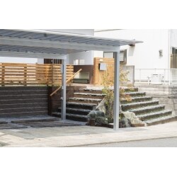 滑る階段の改善策としてタイルの階段を石貼りにします。2台用のカーポートを取付け雨除けとします。庭にある不要の石を利用して、ロックガーデンをご提案しました。