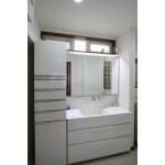 洗面化粧台をW1200を採用しその横に450の収納を設けることで大幅に収納量がUPしました。洗面化粧台の上に設けた窓は開け閉めがスムーズに行えるように電動にしました。