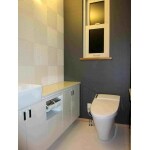 洋便器と小便器を分けていましたが、収納場所と広々と使用されたいとのことで、手洗いカウンター付収納を設置し、されにタンクレスの洋便器を設置することでより広さが実感できます。