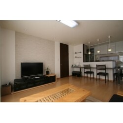 リビングTV背面の壁にはエコカラットを貼り、ペットの臭い対策をすると共に空間のアクセントとしました。フローリングは傷やアンモニアにも強いペット対応の商品で安心です。インテリア 性と実用性を兼ね備えたLDKになりました。