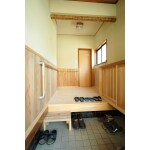玄関の靴箱を大工さんの造作家具へ変更。腰壁も杉の無垢材を張り、玄関戸を開けると木のいい香りが広がります。 手すりも設置し、段差の登り降りから廊下を歩くのも楽になりました。 ホール、廊下、縁側の壁の塗装、腰壁、天井クロス貼りも工事費に含まれています。