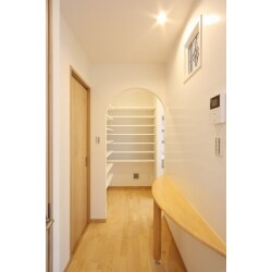 なるべく閉鎖感をなくしたいとのご要望をいただいたので、LDKへの出入口には建具を設けないご提案をさせていただきました。アーチ状の開口に縁取られたパントリーは「見せる収納」としてデザインの一部となっています。 また、玄関正面のステンドグラスはデザインとしてだけでなく、玄関の閉鎖感・圧迫感の解消、明るさ確保にとても効果的です。