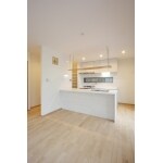 踏み心地が良く、保温性や調湿性に優れたカバ材(バーチ材)の無垢フローリングをご提案させていただきました。 キッチンと壁紙は白で統一し、全体を優しい色合いとすることで明るく広々とした空間に変わりました。 キッチン上部の収納スペースは集成材の棚として、暗くならないよう配慮しています。