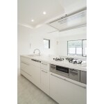 ガラストップのガスコンロに食洗機、白で統一してスタイリッシュなキッチンの出来上がりです。