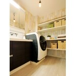 (旧株式会社ハウスドゥでの事例です。)壁のクロスと、お施主様が選ばれた電球の照明がビンテージ感のある空間を演出。洗濯物や洗剤をたっぷり収納できる棚も造作致しました。 「ビンテージ感のある洗面所がお気に入りです!」とお喜び頂けました。