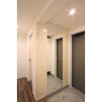 玄関の壁にはミラーと名古屋モザイクタイルのグラマラスタイルを施工しました。美しい反射を見せる波のような特殊面状を持つタイルなので、上品で明るい玄関廻りを演出します。