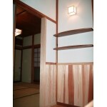 もともと使われていた確かな材料の柱や梁を活かし、塗り壁や杉の腰壁を提案しました。