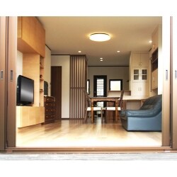 南側を掃出しサッシに変更することで明るさを確保した。同時に壁を撤去するため、サッシ上部の梁と隣に面している玄関ホールの壁を構造用合板で張り補強した。 外部面は充填式断熱材を吹き、サッシをLow-E の断熱式に入替。 リビングは目一杯収納力を向上させるため、家具を製作。