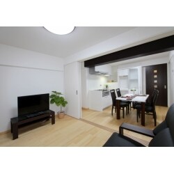 (旧株式会社ハウスドゥでの事例です。)リビング、ダイニング、寝室は扉を開ける事で一つの空間として広く使用でき、風通しの問題も改善できるようご提案。 床には無垢のフローリングを使用、マンションによくある天井の大きな梁は木目調のクロスを貼る事でお部屋のポイントに。