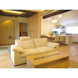独立した和室や洋室をすべて取り払い、空間を贅沢に使ったLDK主体の住まいにアレンジしました。 また、室内の空間にゆとりを生むため、勾配屋根を活かした斜め天井を採用しているのもポイント。奥行きに高さを加えたことで、さらなる広がり感を演出しています。