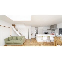 (旧株式会社ハウスドゥでの事例です。)集いの場であるLDKを広げ、上部にダイナミックな吹抜けをご提案。 既存のシステムキッチンを活用しつつ、前方に移動しカウンターを新設。背面に設けたパントリーから洗面化粧室への動線も確保。「以前は開放感もなく閉鎖的な感じでしたが、ここまで広くなるとは思っていませんでした。料理がし易くなりました。家事動線も良くパントリーの容量はすごく助かります!」と奥様にお喜び頂けました。