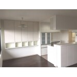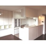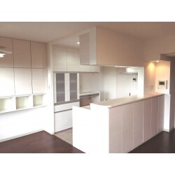 (平成29年4月1日 体制変更以前の(旧)永大プランニングの実績です)マンションに2世帯で住むために、収納を充実させたいとのご希望でしたので、吊戸棚・カップボードの他にキッチンカウンターの下にも収納箇所を取付ました。また、リビングにも収納棚を設置し、シンプルかつ機能的なキッチン&リビングに仕上がりました。