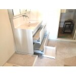 (平成29年4月1日 体制変更以前の(旧)永大プランニングの実績です)2世帯のため、収納に困らないように、洗面化粧台は鏡の裏まで収納棚がある商品を提案させていただきました。 台の引き出し部分もスライドなので、楽に出し入れすることができます。