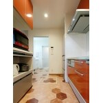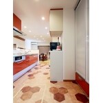 (旧株式会社ハウスドゥでの事例です。)華やかなオレンジのキッチン、ヘキサゴン柄のフロア材をご提案。特にヘキサゴン柄のフロア材は奥様にお気に入り頂けました。