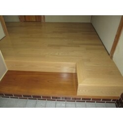 (旧株式会社アトリエ住まいるでの事例です。)床がきしんで気になるのと、ご高齢で玄関での靴の脱ぎ履きが不便だとお聞きしましたので、廊下の床は重ね張りを。玄関は座って靴の脱ぎ履きが出来る様に、上り框に腰掛台を設置をご提案いたしました。