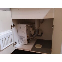 ガス給湯器が設置出来ない条件でしたので、キッチンキャビネット内に、電気式小型温水器の取付を御提案しました。