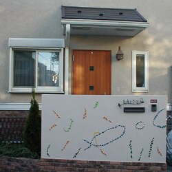 子供が書いた絵をモチーフにしたパーティションは、家族みんなが参加してタイルをはめ込みました。楽しい作業でした。出来上がりにもたいへん満足しています。「可愛らしい」と言ってくださる方もたくさんいらっしゃいます。フェンス前には、つる性の「クレマチス」を植えてもらい、フェンスいっぱいに紫色の花でいっぱいになるのを楽しみにしています。
