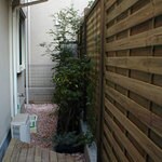 お客様のご要望をお聞きし、お隣との境界には、圧迫感にない温かみのある木製のフェンスをご提案させていただきました。玄関前のフェンスには、目印にもなるようにお子様の絵がタイルで描いてあります。外水道は、可愛らしいモザイクタイルを使うことでガーデニングがいっそう楽しくなります。