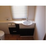 直接、壁紙を貼ってしまうと木のヤニが染み出てくるおそれがあったため、薄い下地材を丁寧に貼って、その上に汚れに強い壁紙で仕上げました。 カウンターや手洗い下の収納家具もオリジナルで制作致しました。最新式のタンクレストイレにぴったりの素敵な空間が完成しました。