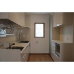 収納力を多く、且つ、家族皆が出入りする動線を確保するために、 壁付けのⅠ型キッチンにしました。冷蔵庫の場所なども、家族がスムーズに使えるようにキッチン全体を配置しました。食洗器・換気扇も最も使いやすいものを採用しました。