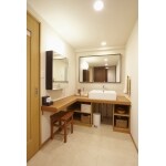 洗面所でお化粧もするという生活スタイルに合わせて、洗面エリアとお化粧エリアを備えたL型のカウンターを使った造作洗面台を設計しました。