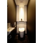 トイレは思い切って、インパクトのあるデザインにチャレンジしたいという要望に答え、正面にはホワイト、両サイドの壁面には正反対のブラックのクロスを用いて、明確なコントラストによってシャープな印象に仕上げました。