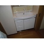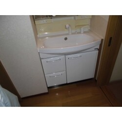 カタログからご希望のデザインを選んでいただきました。 なお、洗面化粧台を置く場所の幅が決まっており、ぴったりと合わないので、隙間部分は物が落ちないようにキッチンパネルで隙間を無くすことを提案。