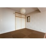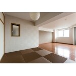 壁面には白のエコカラットを貼り、モダンな印象に。琉球畳とエコカラットを市松模様に仕上げ、デザインの統一性をはかりました。
