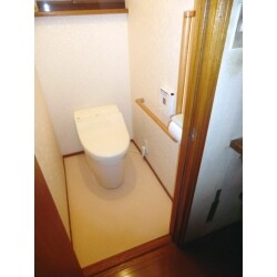 便座の高いトイレをおすすめし、手すりもつけタンクレスのすっきり広々したトイレルームになりました。