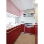大好きな赤を採用し、趣味のお菓子づくりを心から楽しめるキッチンに。赤だけだと雰囲気が重くなるので、上の吊収納にピンクを提案しました。