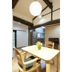 使われなくなっていた”かまど”があった場所に、床を張りダイニングスペースを作りました。元の天井が高くなっていたのを利用し、勾配天井にしました。古民家としてのイメージを出す為に、天井や壁の梁を見せるように提案しました。壁は、漆喰の塗り壁です。中央の照明とは別に、壁にスポットライトを付けました。暖房器具は、深夜電力を熱源とした蓄熱暖房機を設置しました。輻射熱で一日中温かく、居心地の良い空間になりました。