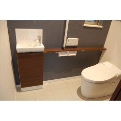 タンクレスのトイレ、手洗い器奥行き160のものを提案し、 トイレ内の空間を広く演出いたしました。 高級感のあるダークなイメージのために、紺色のアクセントクロスを入口正面はりつけて、紺色とベストマッチの茶色の手洗い器をセレクトしました。それ以外のクロスは、消臭効果があり、清潔感あふれる白色のクロスをセレクトしました。トイレの便器と色が合い、統一感があります。