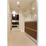 洗面化粧台の扉は浴室に合わせて木目にしました。