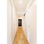 玄関収納は既存のものを壁面に固定して浮かして設置しました。廊下の途中に段差があったのですが、解消してバリアフリーになりました。 扉はすべてホワイト色にしたことで壁紙と一体感が出て広く見えます。