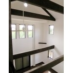 白い壁紙と濃い茶色に塗装された、コントラストの美しい吹き抜けリビングが出来上がりました。