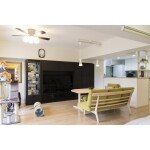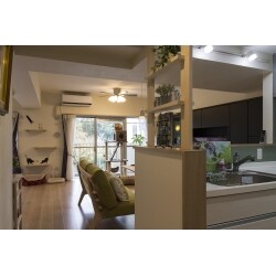 間取りを変えて和室・ダイニング・キッチンを大きなLDKにします。 キッチンは位置と向きを変えて対面に、以前キッチンが入っていた部分は大容量の収納に変更。廊下との境に壁を造らず開放的になるキッチンですが、「丸見えより少し目隠しになるものがあった方が・・・」とのご要望から飾り棚を造作で設置。 リビング部分の窓のカーテンレールや壁面にキャットウォークを取り付け、2面が窓になるリビングの最奥にはご主人用の喫煙スペースを造りました。 娘さんのお部屋や猫のトイレがある洗面の扉には、猫が自由に出入りできる扉を取り付けたり、上られては困るテレビボードの上は下がり壁を造り猫が上がれない様にしてペットに配慮しました。