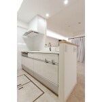 高級感のあるキッチンにするために、床やキッチンパネルなどを白を基調としてリフォームしました。キッチン前面・側面の既存の白いキッチンタイルを使えるように、キッチンの形は変えずに同じ壁付けI型で交換をしました。ワークトップは花柄の人工大理石で、汚れがついてもメラミンスポンジでさっと拭くだけできれいになり清掃性にも優れています。キッチンリフォームに合わせて照明も、ダウンライトに変えることで、ホテルライクなリビング・ダイニングとも合う、雰囲気のある素敵なキッチンとなりました。