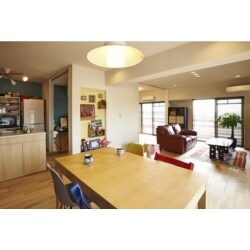 (旧東京ガスリモデリング株式会社での事例です。)広々したルーフバルコニーが気に入り、物件購入を決めたお客さま。お気に入りのルーフバルコニーまで視線が抜ける間取りプランにより、明るく開放的なリビングが実現しました。床材には、無垢のカバザクラを採用し、お手持ちのインテリアが馴染む空間に。リビング中央のニッチにはお子さまの作品を飾るスペースを設け、イエローのペイントはお客さまご自身が塗装されました。「スイスで知り合った友人が遊びに来たときに『ここはスイスみたいだね』と言ってくれました。理想の空間が叶いました」とお客さまもお喜びいただいています。