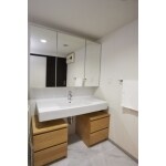 (旧東京ガスリモデリング株式会社での事例です。)お客さまこだわりの洗面化粧台と大きな鏡の、シンプルで明るいサニタリー空間となりました。