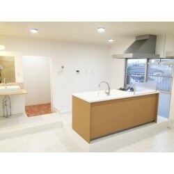 築40年のマンションが大変身! お客様ご希望のアイランドキッチンと、リビングに造作で造った洗面台を置きました! 白を基調にしているので、部屋全体がかなり広く見えます。 ダイニング以外はもともと和室でしたが、白いフローリングでモダンな空間になりました