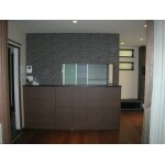 ダイニングスペースとなるキッチンカウンター前面にはオリジナルの壁面収納を設置。内装も部分的に仕上げを変えるアクセントクロスをご提案しました。