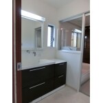 ダークオーク色の洗面化粧台が映えるよう、内装は白色を基調にしました。