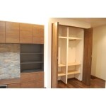 大工さんの手作り造作収納を御提案致しました。 扉は、TVボードと合わせた色で塗装し、統一感を演出いたしました。 間取りの関係で、奥行き455のサイズしか取れなかったのですが、そのままハンガーを利用して洋服をかけると肩の部分がはみ出してしまいます。 しかし、洋服を正面にかけられるように、専用の洋服バーを取りつけて、左右で合計30着収納することを実現致しました。小さなスペースでもアイディア1つで毎日の生活しやすいポイントになりますね。