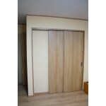 洗面化粧台は交換せず、収納の設置と内装の工事を行いました。洗濯機と化粧台の間に30センチの収納を置けるスペースがあったので、上段が開き扉で、下段がスライド式の収納を提案しました。洗面所の入口のドアは、下枠の付いていない引き戸に交換したので床の段差が解消されました。万が一、車いすを使用する時にもそのまま入れるようになっています。