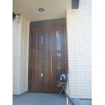 リフォームタイプの玄関ドアで、デザイン性の高いYKKのヴェナートをおすすめしました。また、廊下の収納を一部撤去し、ホールを広げて飾棚を取り付けました。