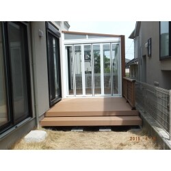 お客様の中ですでにイメージが固まっていらっしゃったので、ご希望に近いものをお探しし、お住まいの条件に合うようプランをお作りしました。まだ小さいお子様の遊び場として、また洗濯物の干場としてのご利用をお考えとのことでしたので、竿掛けなども取付けました。内と外との間のフリー空間を、いろいろなアレンジで楽しんでいただきたいと思います。